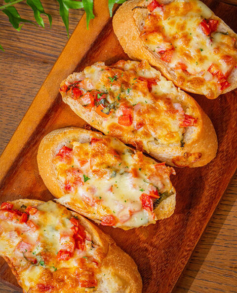 Corte o pão pelo meio e coloque ambas metades sobre uma assadeira. Por cima de cada pão divida o molho de tomate, espalhando-o bem para cobrir toda a superfície.